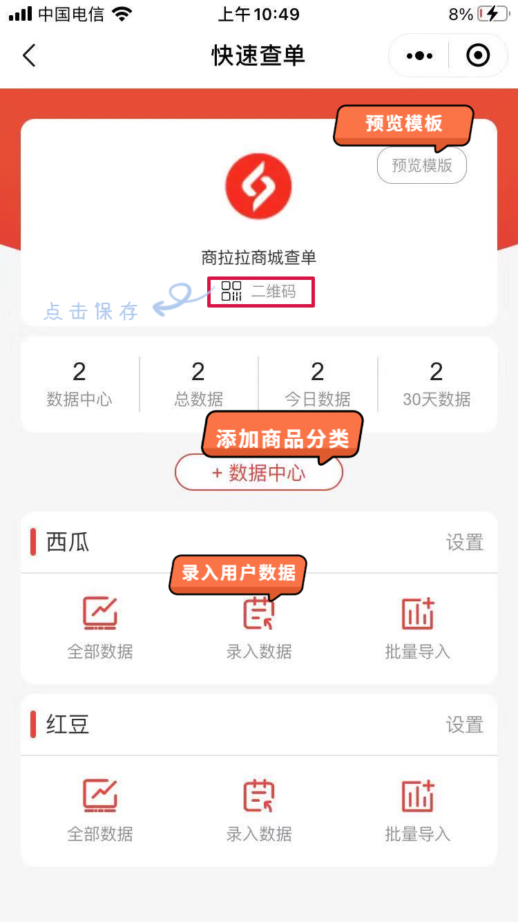 录入商品数据 :点击 “+ 数据中心” 添加 “番薯”