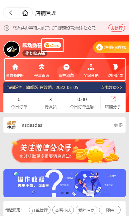 在店铺管理中,店铺上方的只有三个栏目,对于商家来说,更方便的操作能够增加商家的使用效率,为此商拉拉针对商家进行更新