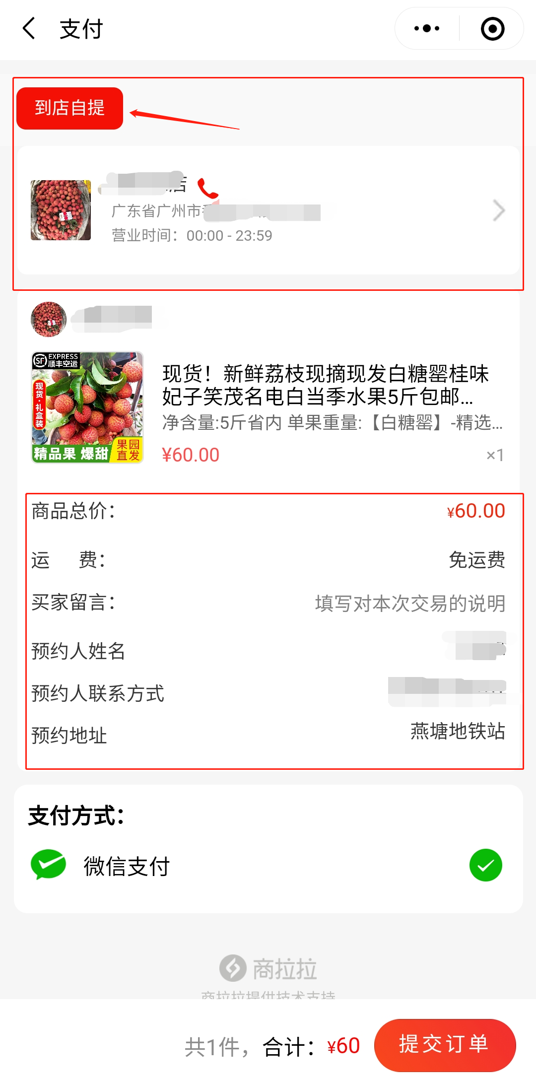 用户在支付页面,也会显示这个门店的商品是“到店自提”