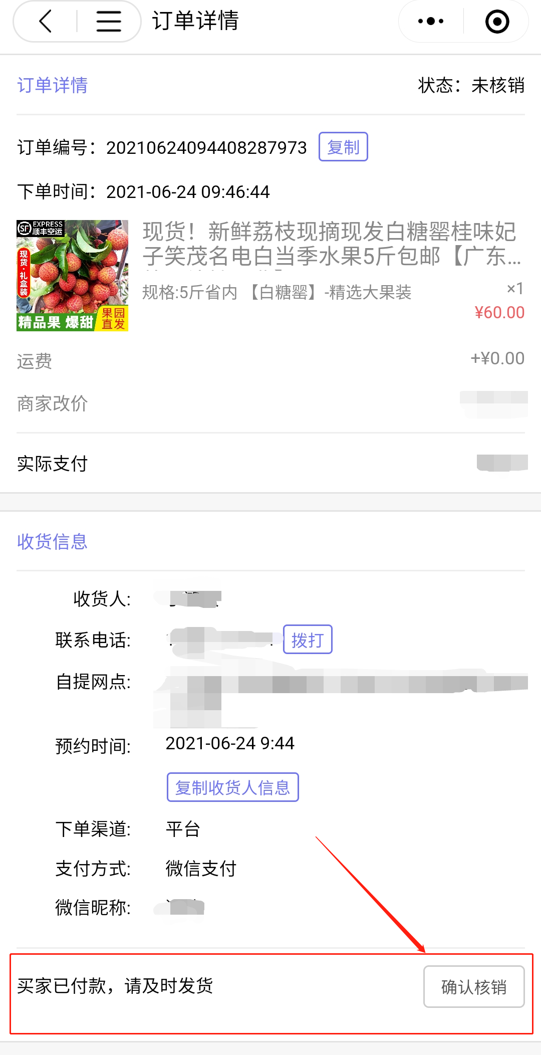 在商家订单上,则会显示“确认核销”,可以不需要扫码即可核销订单。