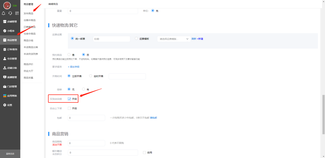 这样门店就拥有自提功能,那怎么样才能发布自提的商品呢?很简单,只需要再发布商品将自提打开,再保存就可以了。