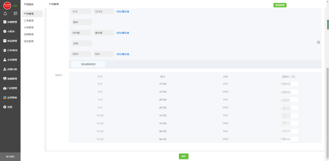 回收商品规格设置