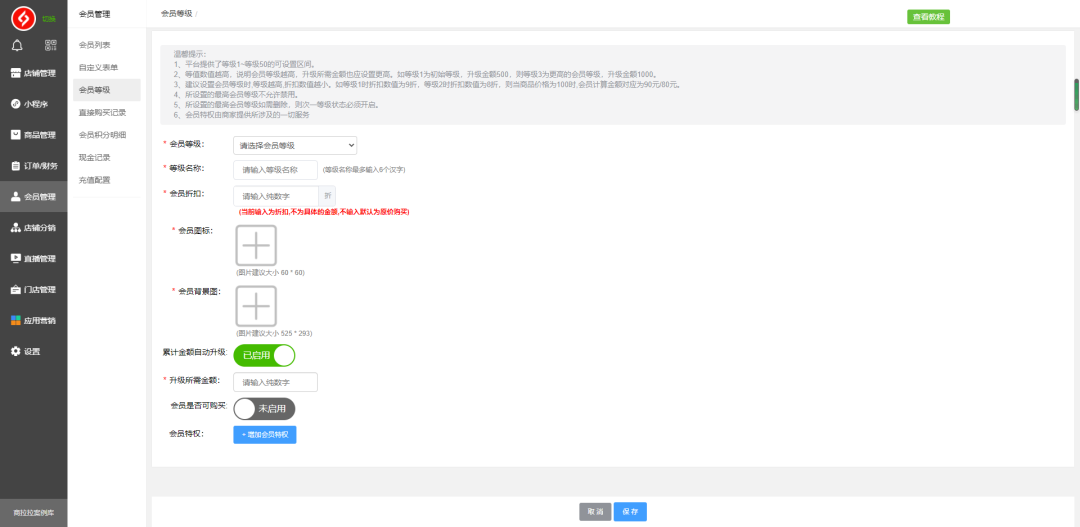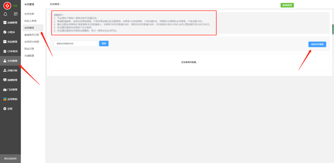 在电脑端商家后台:会员管理-会员等级,点击添加会员等级(上方有介绍该等级的设置注意事项)