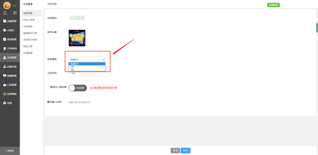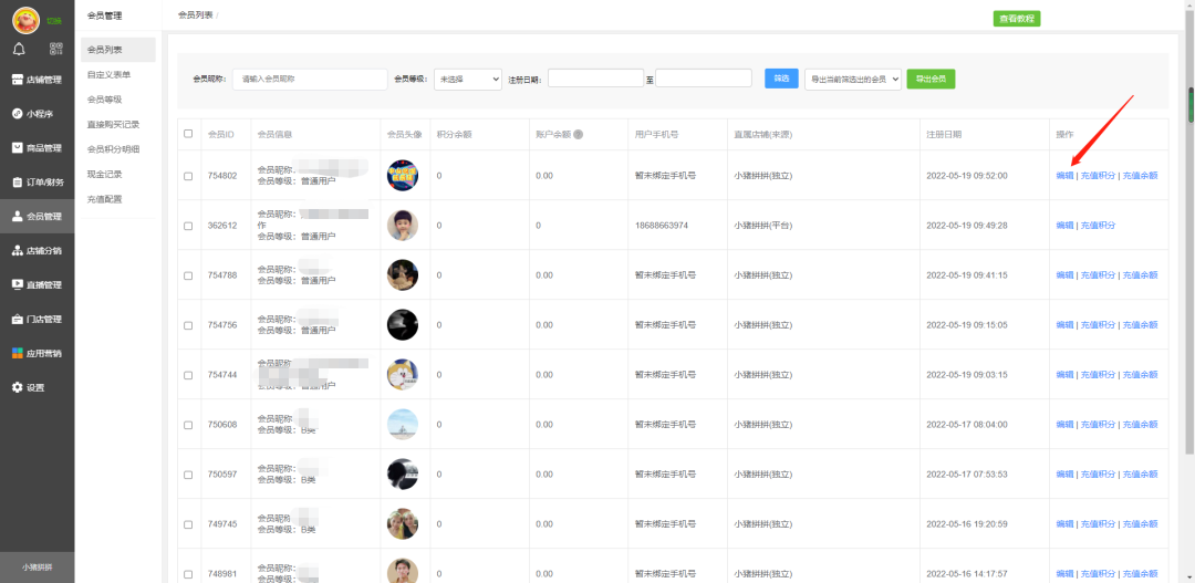 会员管理-会员列表,找到需要设置会员等级的用户,点击编辑。